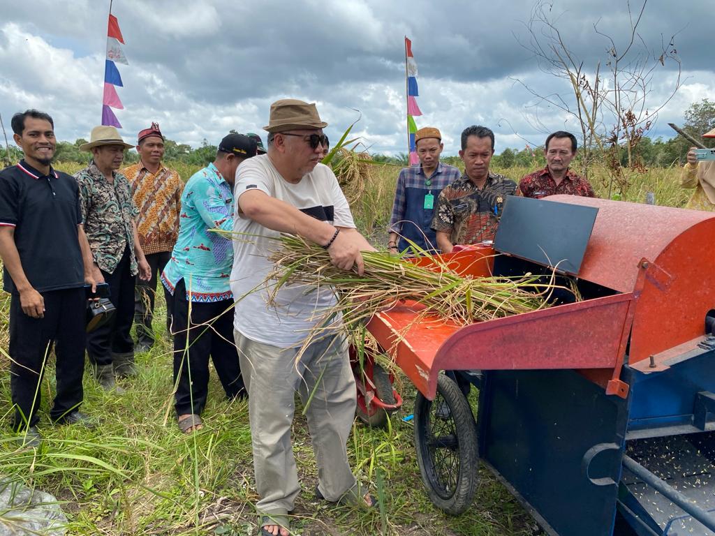 Dalam panen raya ini, Sukirman didampingi Kepala Dinas Ketahanan Pangan dan Pertanian Kabupaten Bangka Barat Azmal AZ, meninjau langsung proses panen menggunakan mesin gilingan padi.