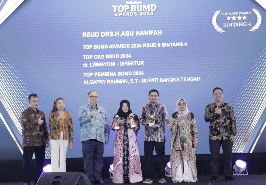 Penghargaan ini diterima pada acara puncak Top BUMD Awards 2024 di Jakarta. Bupati Bangka Tengah, Algafry Rahman sebagai Top Pembina BUMD 2024 dan Direktur RSUD Drs. H. Abu Hanifah Bangka Tengah, dr. Lismayoni dianugerahkan penghargaan sebagai Top CEO BUMD.