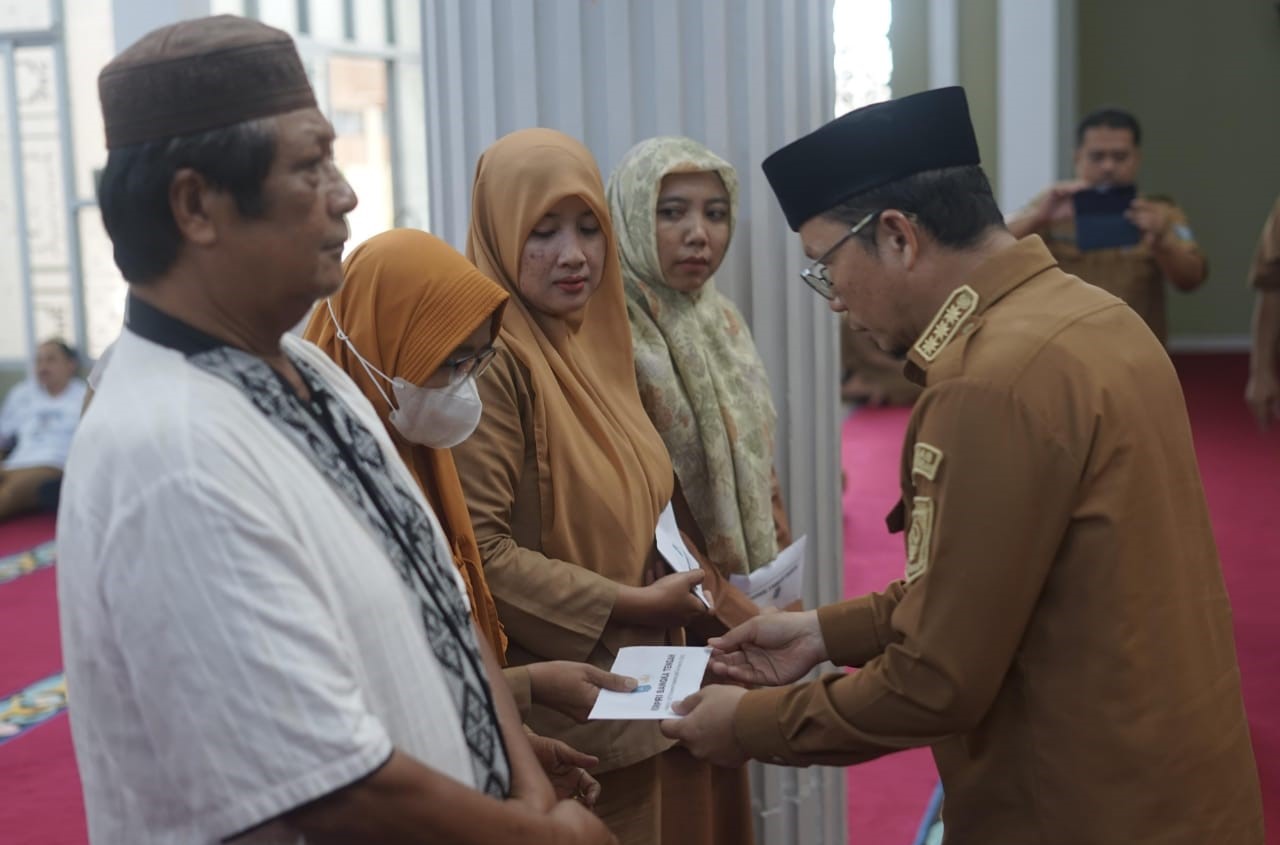 Bupati Algafry menyerahkan santunan kepada 18 anggota Korps Pegawai Republik Indonesia (KORPRI) Bangka Tengah di Masjid Ar-Raihan Koba, Senin (1/4). Foto: IST