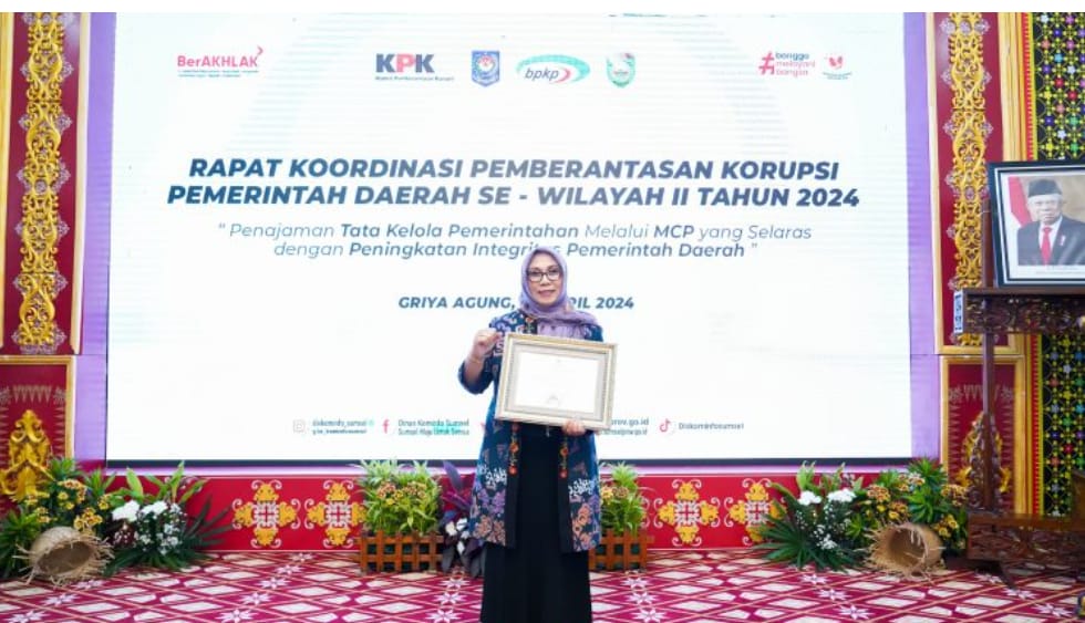Pj Wali Kota Pangkalpinang, Lusje Anneke Tabalujan menerima penghargaan dari KPK di Palembang, Sumatera Selatan, Selasa (23/4). Foto: IST