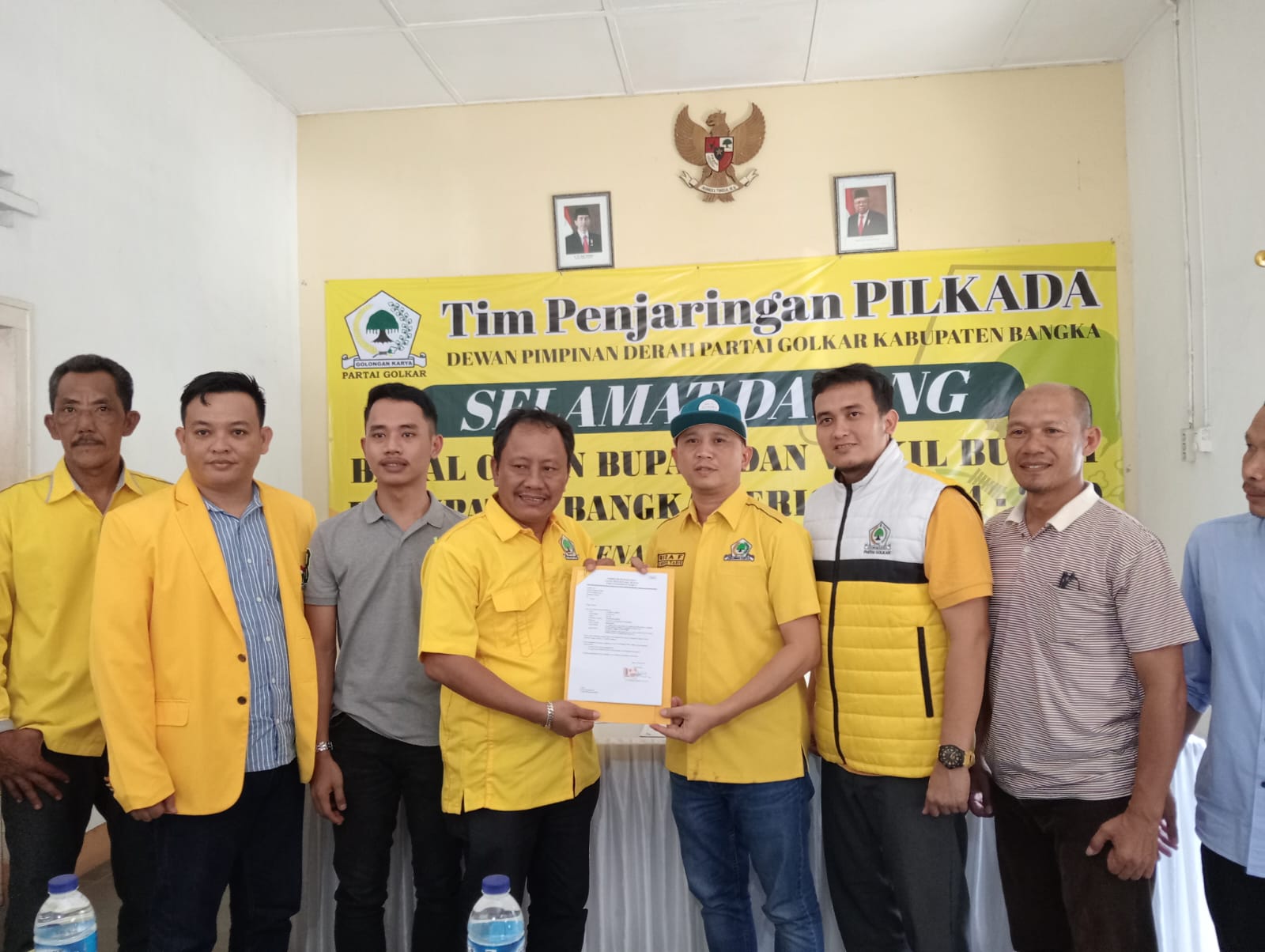 WARTABANGKA.ID, SUNGAILIAT – Pengusaha tambak udang yang juga politisi Partai Golkar, Syahrial Ridho mengambil dan mengembalikan formulir bakal calon bupati di Partai Golkar dan Partai Keadilan Sejahtera (PKS), Selasa (21/5).