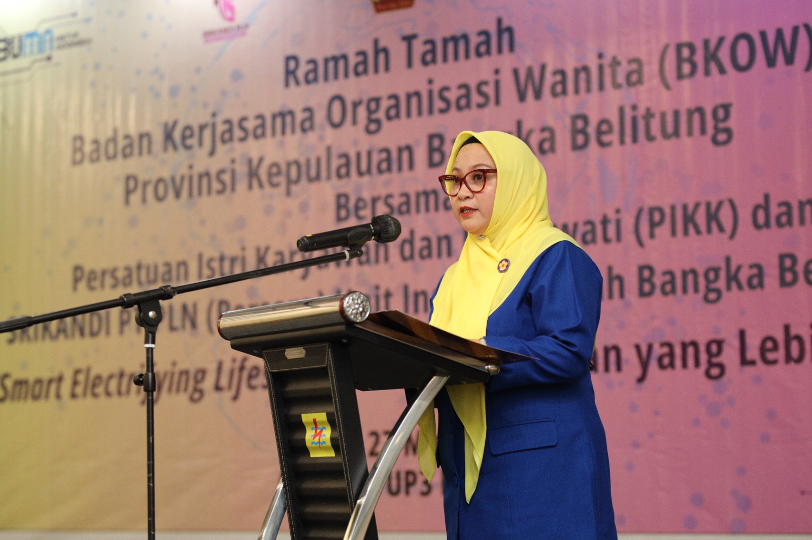 Ketua PIKK PLN Wilayah Babel Imelia Munief Budiman memberikan sambutan saat kegiatan ramah tamah Badan Kerjasama Organisasi Wanita (BKOW) Provinsi Babel, Senin (27/5). Dalam kesempatan itu menyatakan harapannya agar kegiatan ini dapat menginspirasi kita semua menjadi wanita yang cerdas dengan menerapkan Electrifying life style sehingga dapat mengurangi emisi karbon. Foto: IST