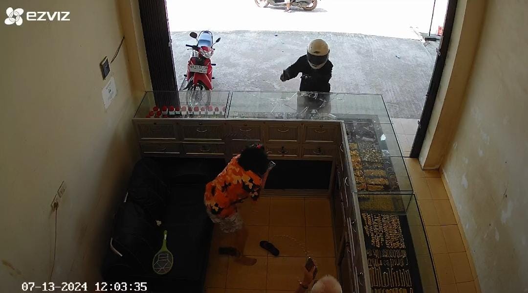 Kejadian perampokan yang sempat terekam kamera CCTV toko tersebut, memperlihatkan 1 dari 2 pelaku turun dari sepeda motor jenis matic secara cepat menggasak sejumlah emas dengan memecahkan etalase kaca diduga mengguna sebuah palu.
