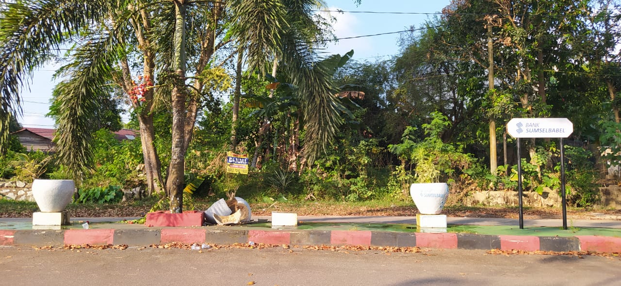 Terlihat juga pecahan yang masih menumpuk di tengah trotoar pemisah jalur 2. Diketahui, hiasan terdapat tulisan “Asak Kawa Kite Pacak” itu merupakan bantuan program CSR dari Bank Sumsel Babel.