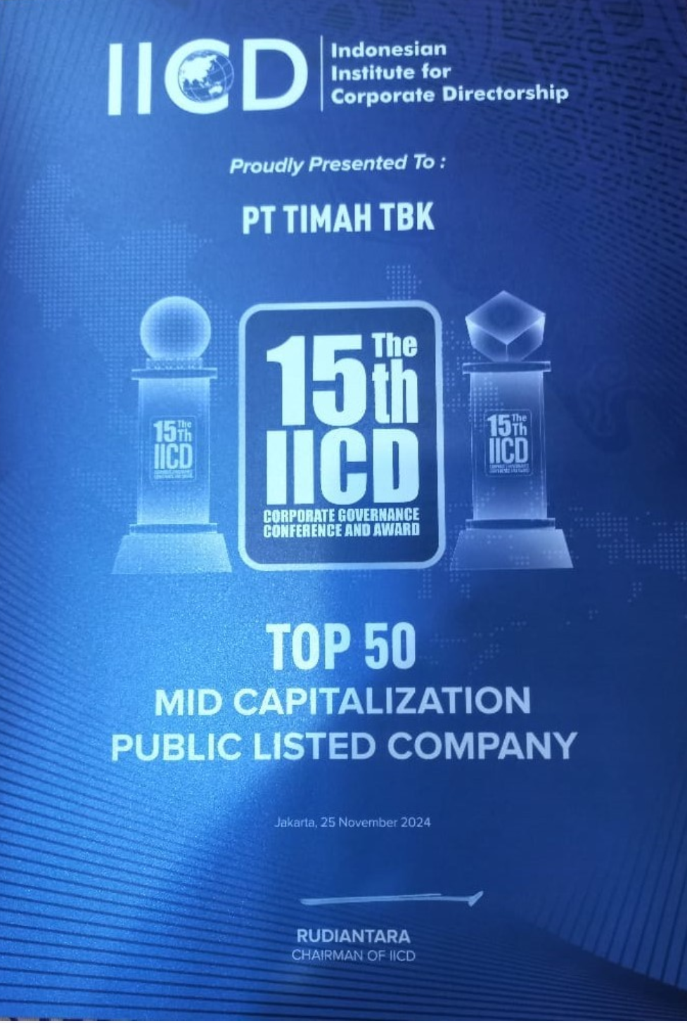 Sebelumnya, tahun 2023 PT Timah Tbk meraih penghargaan Top 50 Middle Capitalization Public Listed Company (Mid Cap PcLS) dengan praktek tata kelola perusahaan terbaik dalam katagori CG Best Overall.