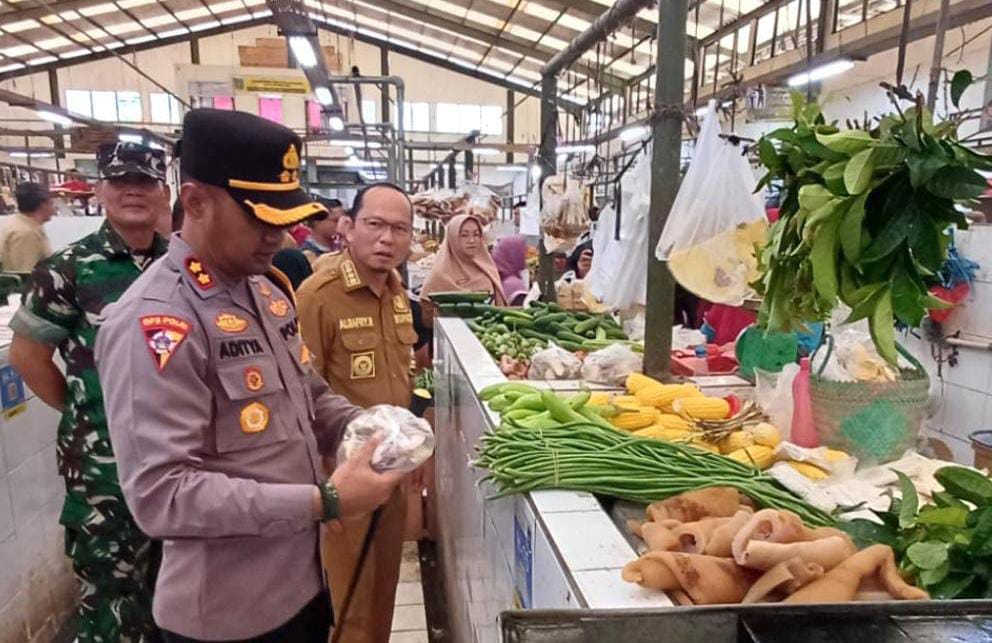 Kapolres menyempatkan diri berinteraksi langsung dengan para pedagang dan pembeli sambil meninjau beberapa bahan pokok utama seperti beras, minyak goreng, daging, dan sayuran.