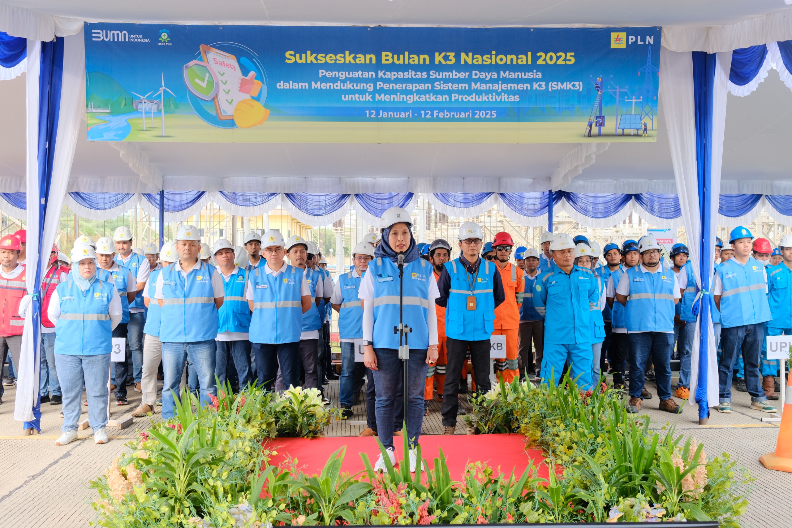 Setelah selesai mengikuti apel secara daring, Dini Sulistyawati berikan sambutan kepada peserta apel di Bangka dan Belitung dengan peserta sekitar 300 orang yang terdiri dari pegawai PLN, PLN Group Wilayah Babel, dan Mitra Kerja akan pentingnya penerapan K3 sebagai investasi strategis yang mendukung produktivitas menuju Zero Harm dan Zero Loss.