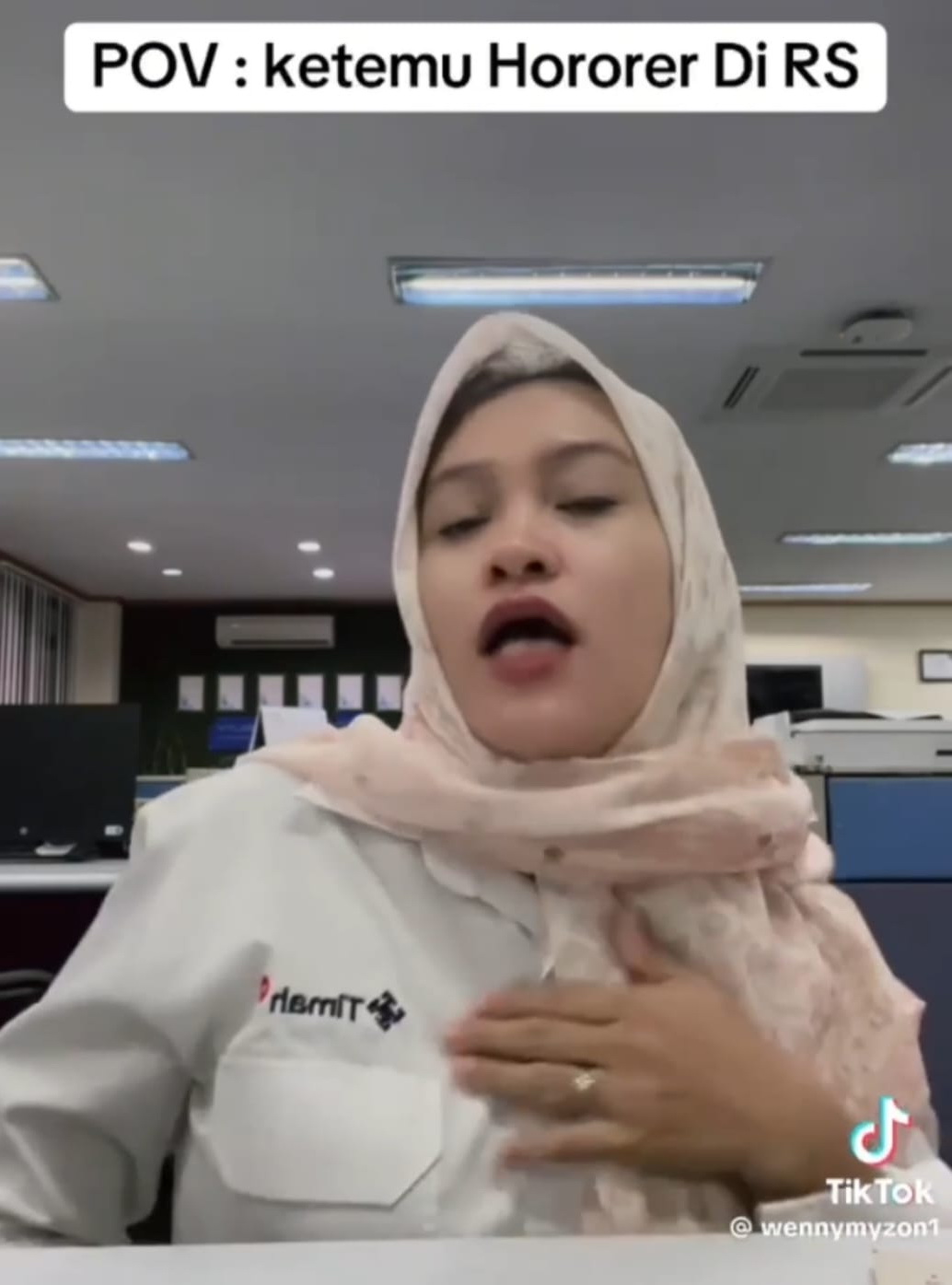 Pasalnya, video yang bertuliskan “POV: ketemu Hororer Di RS” milik akun tersebut, menampilkan seorang wanita berhijab dengan mengenakan seragam putih, sedang berada di sebuah kantor.
