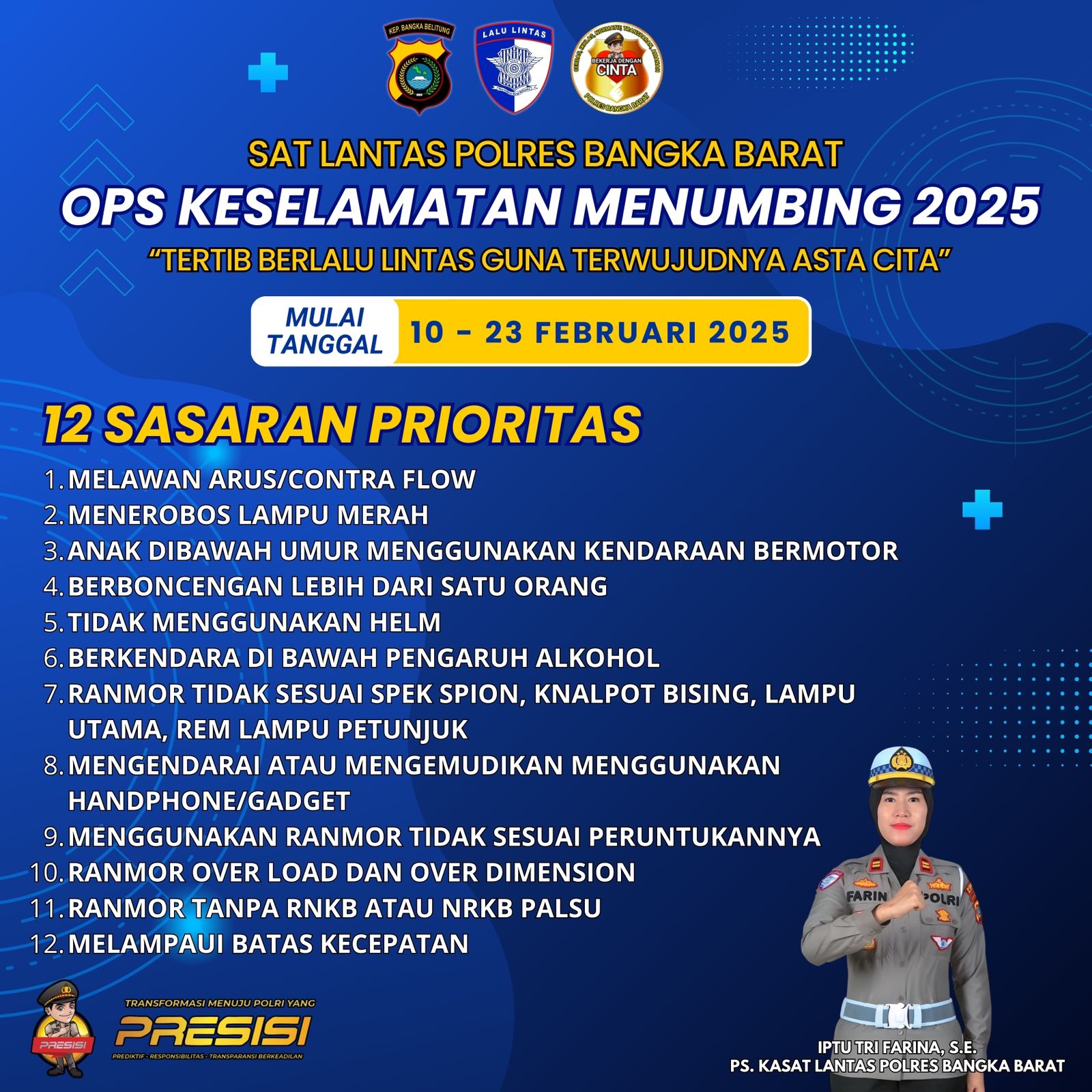 Kapolres Bangka Barat AKBP Ade Zamrah melalui Kasat Lantas IPTU Tri Farina mengatakan, Operasi Keselamatan Menumbing 2025 dilaksanakan dengan tujuan untuk mengurangi angka pelanggaran lalu lintas.