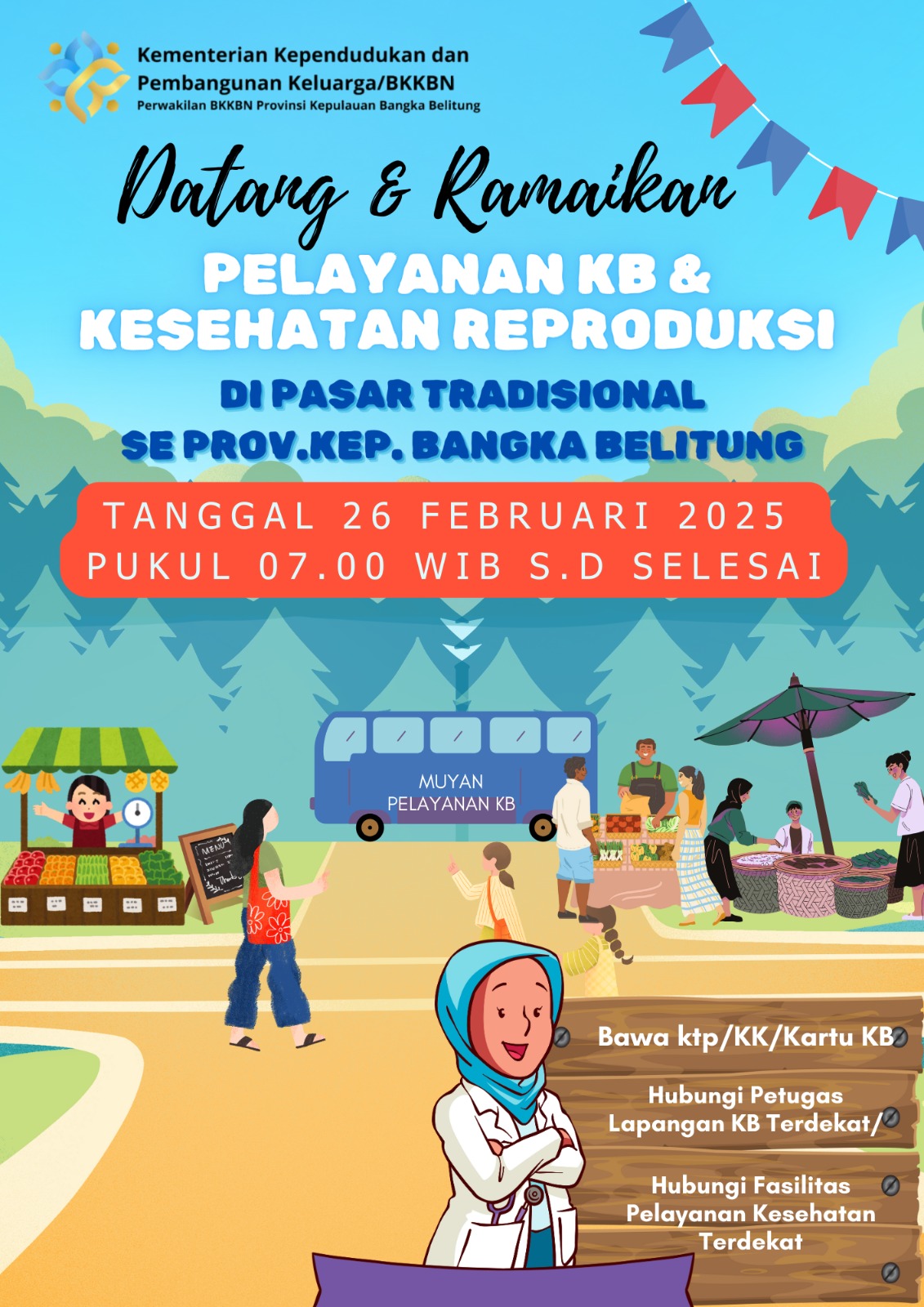 WARTABANGKA.ID – Dalam rangka mendekatkan akses pelayanan KB dan kesehatan reproduksi kepada masyarakat, Kementerian Kependudukan dan Pembangunan Keluarga/BKKBN akan menyelenggarakan pelayanan KB dan kesehatan reproduksi di pasar tradisional secara serentak di seluruh Indonesia.