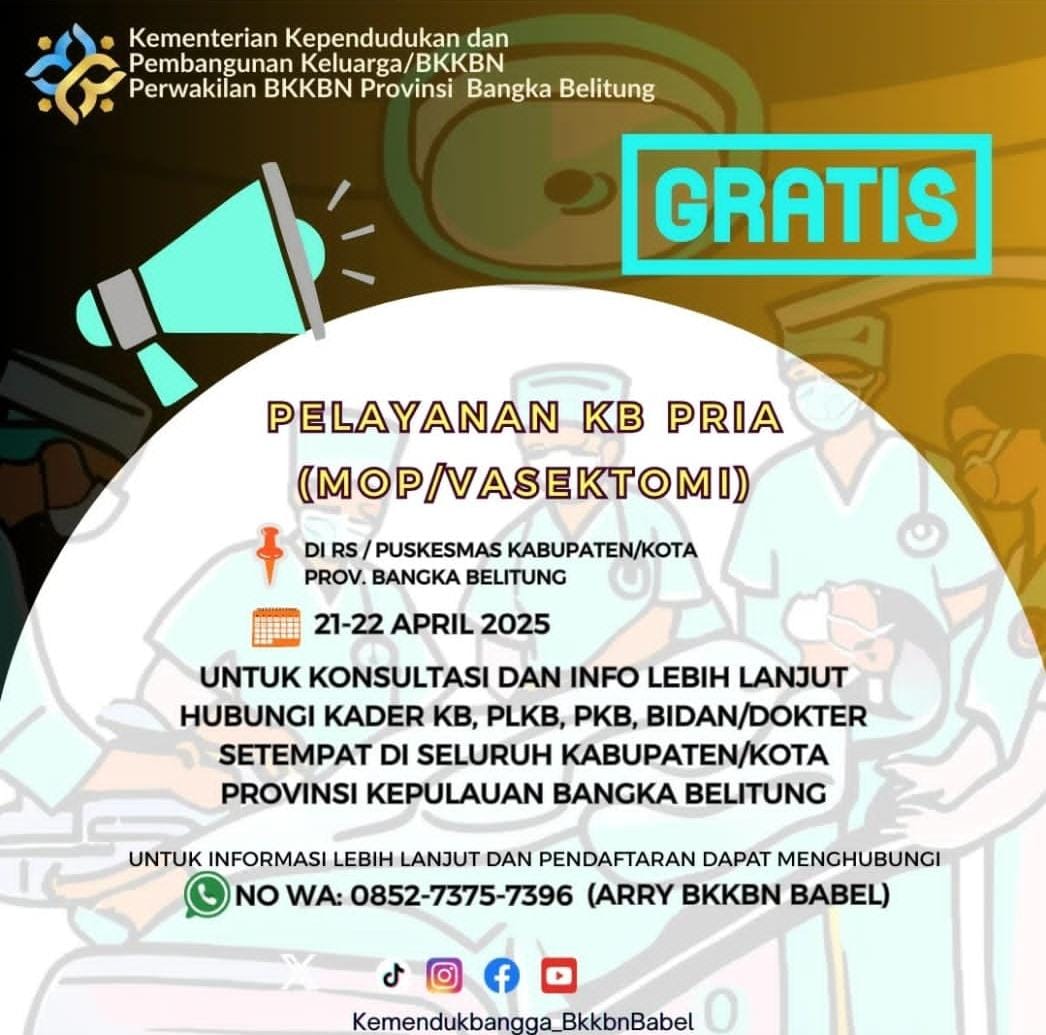 WARTABANGKA.ID — Perwakilan Badan Kependudukan dan Keluarga Berencana Nasional (BKKBN) Bangka Belitung akan menyelenggarakan pelayanan Medis Operasi Pria (MOP) serentak seluruh Indonesia, pada tanggal 21 – 22 April 2025 di seluruh puskesmas yang ada di Babel.