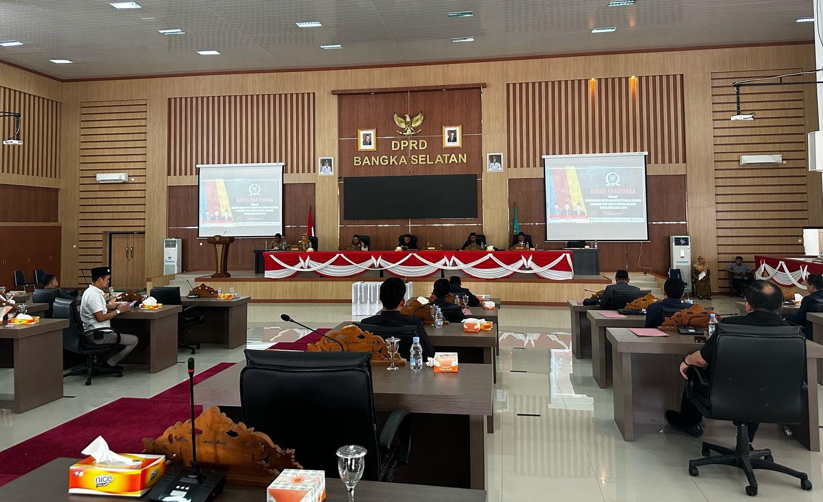 Acara yang berlangsung di Ruang Rapat Paripurna Junjung Besaoh dipimpin langsung oleh Ketua DPRD Basel Erwin Asmadi, wakil Ketua dan anggotanya, serta dihadiri pula Wakil Bupati Basel Debby Vita Dewi, Pj Sekda Basel Hefi Nuranda serta kepala OPD di lingkungan Pemkab Basel.