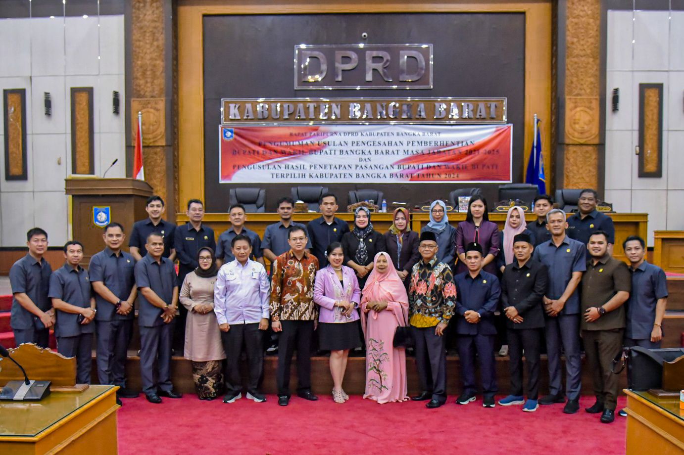 WARTABANGKA.ID, MENTOK – DPRD Kabupaten Bangka Barat melaksanakan rapat paripurna dengan agenda pengumuman usulan pengesahan pemberhentian Bupati dan Wakil Bupati Bangka Barat masa jabatan 2021 – 2025 dan pengusulan hasil penetapan pasangan Bupati dan Wakil Bupati Terpilih Bangka Barat tahun 2024 di Gedung Mahligai Betason II, Kecamatan Mentok, Rabu (30/4).