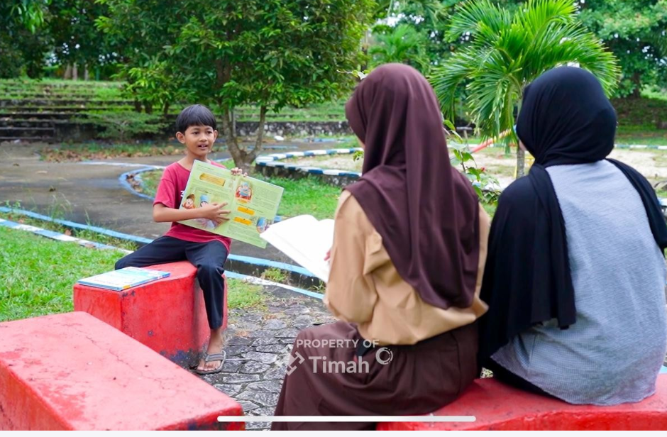 “Awal tahun 2011 anak-anak di sini enggak ada tempat untuk bergabung membaca bersama kalau ada PR kerja kelompok. Akhirnya ini diinisiasi oleh PT Timah dibuatlah Taman Baca ini. Jadi anak-anak kalau sore ngumpul di sini membaca, belajar bersama, bermain permainan edukasi dan juga bermain di taman,” kata wanita yang kerapa disapa Bunda Elza ini.