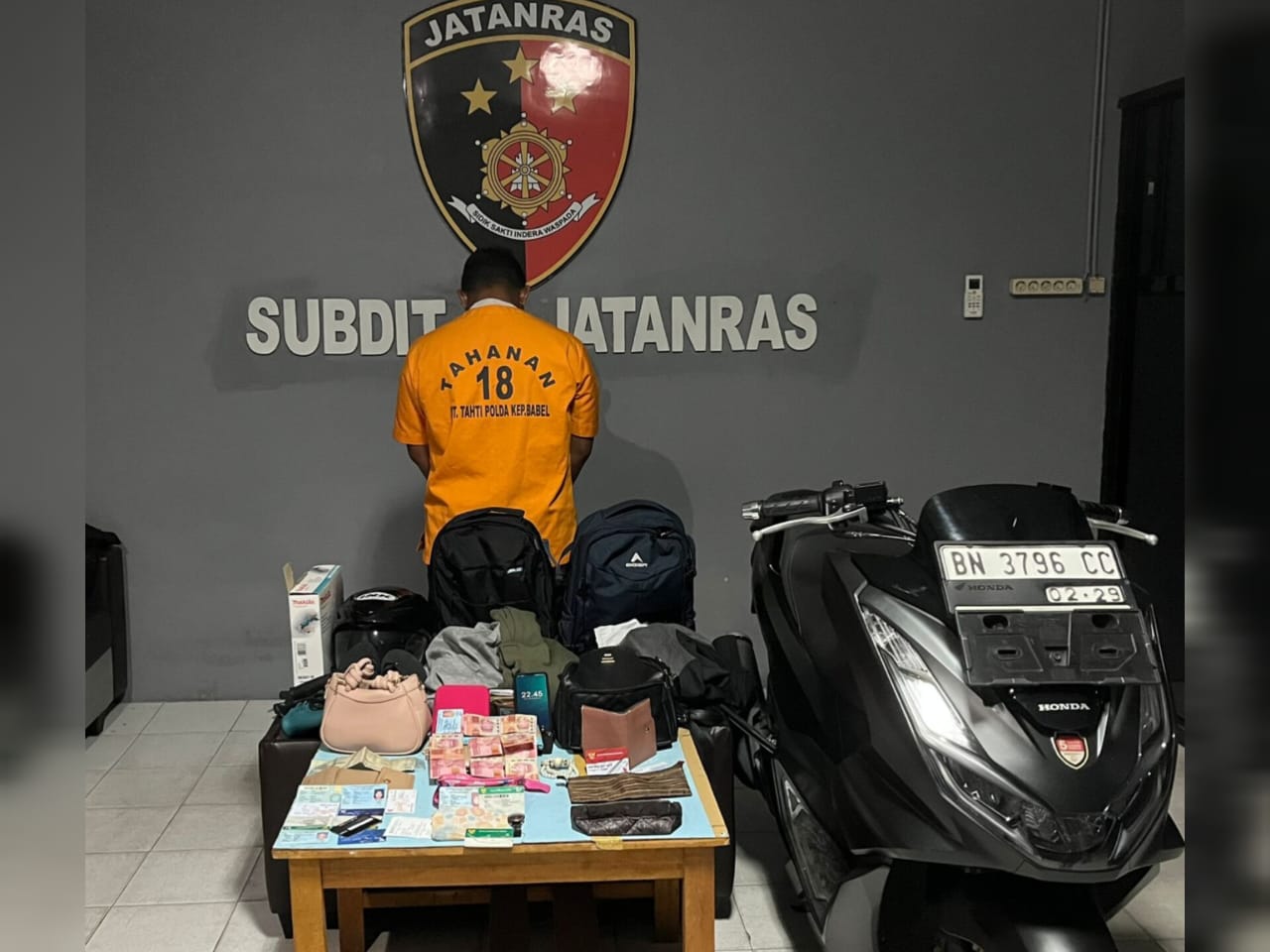 Adapun barang bukti yang diamankan antara lain 1 unit sepeda motor milik pelaku, uang tunai sebesar Rp 3.700.00, 1 buah bor, beberapa buah tas dan kartu identitas milik para korban.