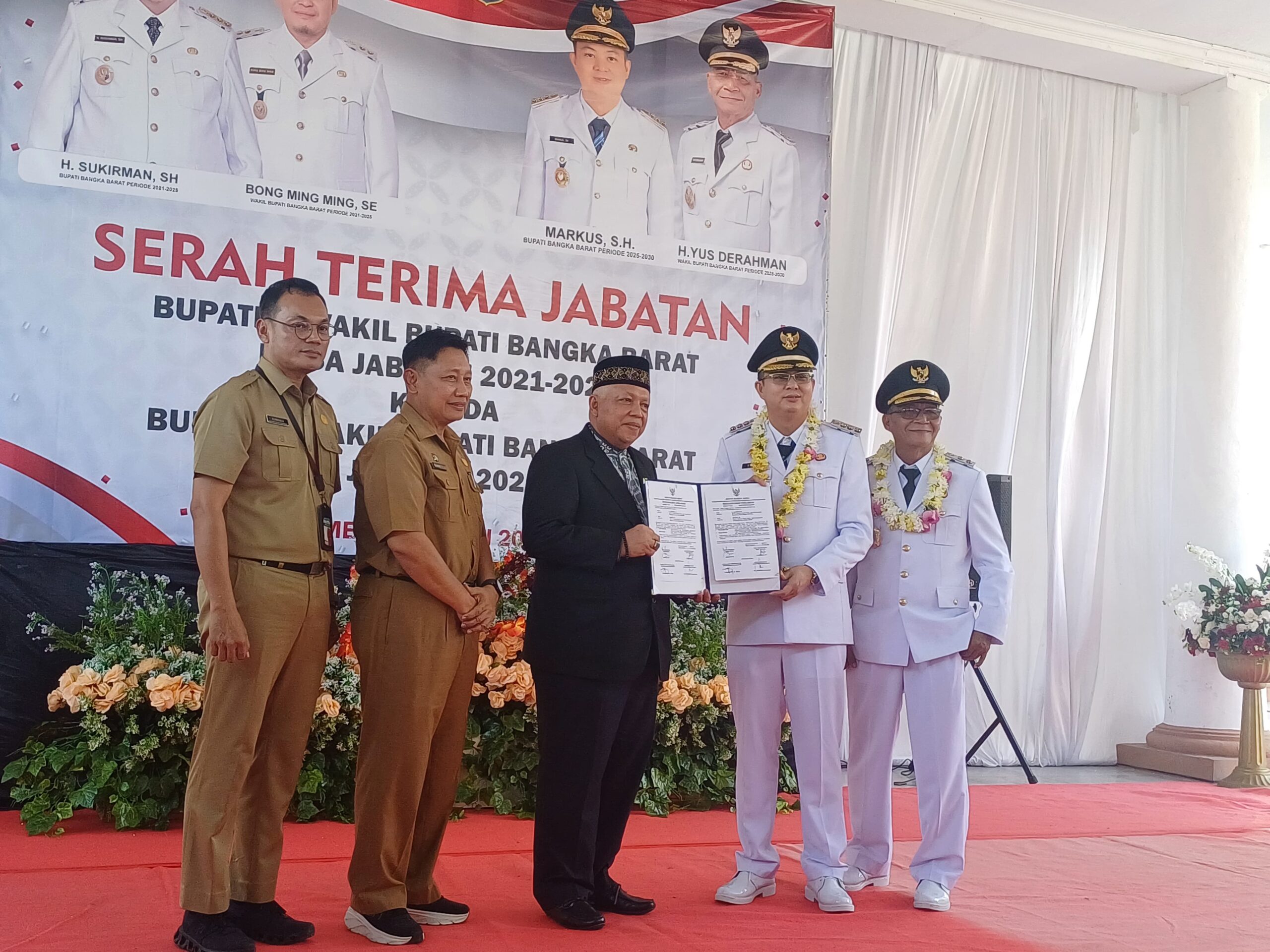 WARTABANGKA.ID, MENTOK – Pemerintah Kabupaten Bangka Barat menggelar acara serah terima jabatan Bupati dan Wakil Bupati Bangka Barat masa jabatan 2021 – 2025 dengan Bupati dan Wakil Bupati Bangka Barat masa jabatan 2025 – 2030. Kegiatan ini berlangsung di rumah dinas Bupati Bangka Barat, Kecamatan Mentok, Selasa (3/6).