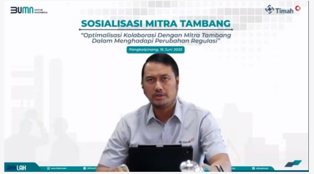 WARTABANGKA.ID – Untuk memperkuat tata kelola perusahaan dalam kemitraan tambang, PT Timah menggelar Sosialisasi Mitra Tambang ‘Optimalisasi Kolaborasi Dengan Mitra Tambang Dalam Menghadapi Perubahan Regulasi’ yang dilaksanakan secara virtual, Senin (16/6/2025).