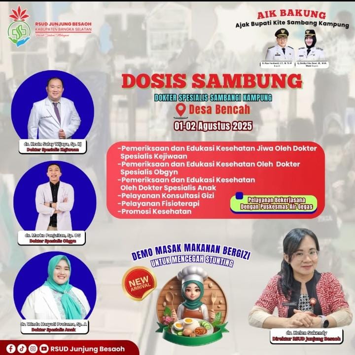 Kali ini, melalui program Dosis Sambung (Dokter Spesialis Sambangi Kampung), tim dokter spesialis akan hadir langsung di Desa Bencah, Kecamatan Air Gegas, pada tanggal 1–2 Agustus 2025 dalam agenda Aik Bakung (Ajak Bupati Kite Sambang Kampung).