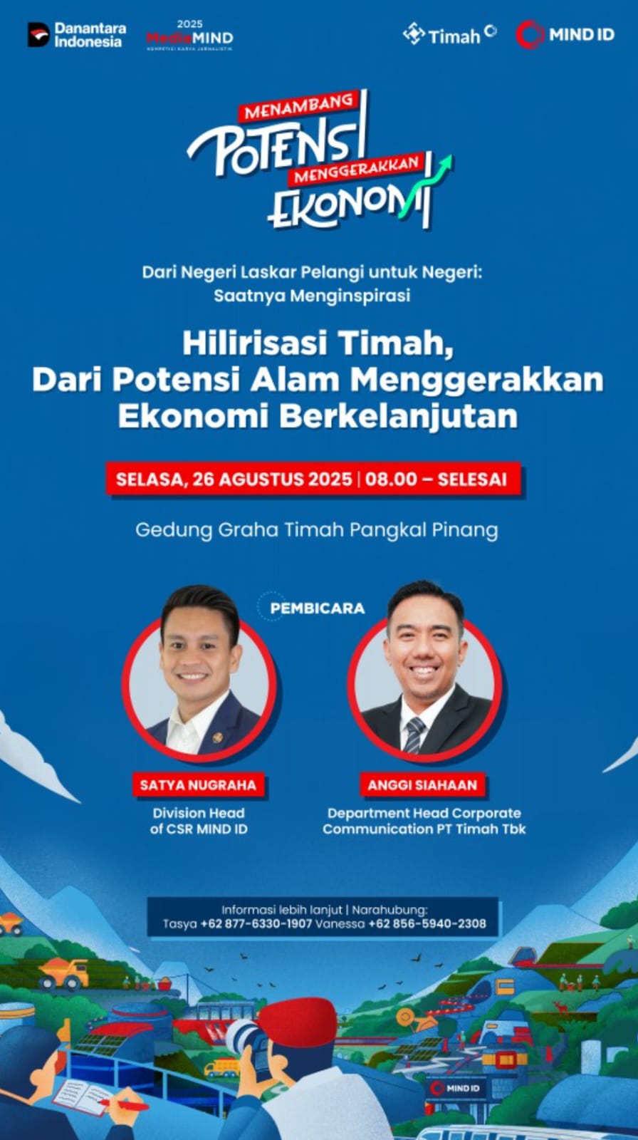 WARTABANGKA.ID – Holding Industri Pertambangan Indonesia MIND ID bersama PT Timah Tbk akan menggelar sosialisasi MediaMIND dengan tema ‘Menambang Potensi Menggerakkan Ekonomi’ yang akan dilaksanakan di Provinsi Kepulauan Bangka Belitung tepatnya di Graha Timah Pangkalpinang pada Selasa (26/8/2025).