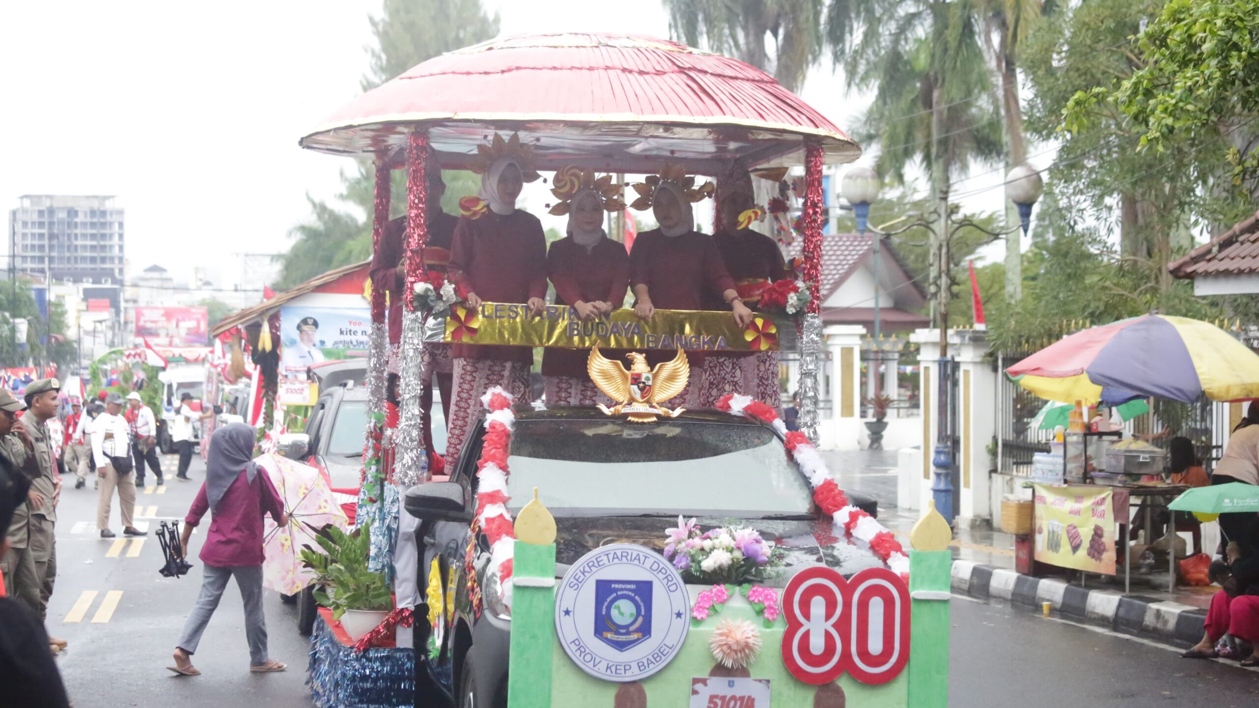 Di antara deretan kendaraan hias yang memukau, Sekretariat DPRD Babel tampil mencuri perhatian. Dengan mengusung tema “Lestarikan Budaya Bangka”, kendaraan hias dihiasi ornamen tudung saji khas Negeri Serumpun Sebalai, melambangkan kearifan lokal sekaligus warisan budaya yang telah mengakar dalam kehidupan masyarakat Bangka Belitung.