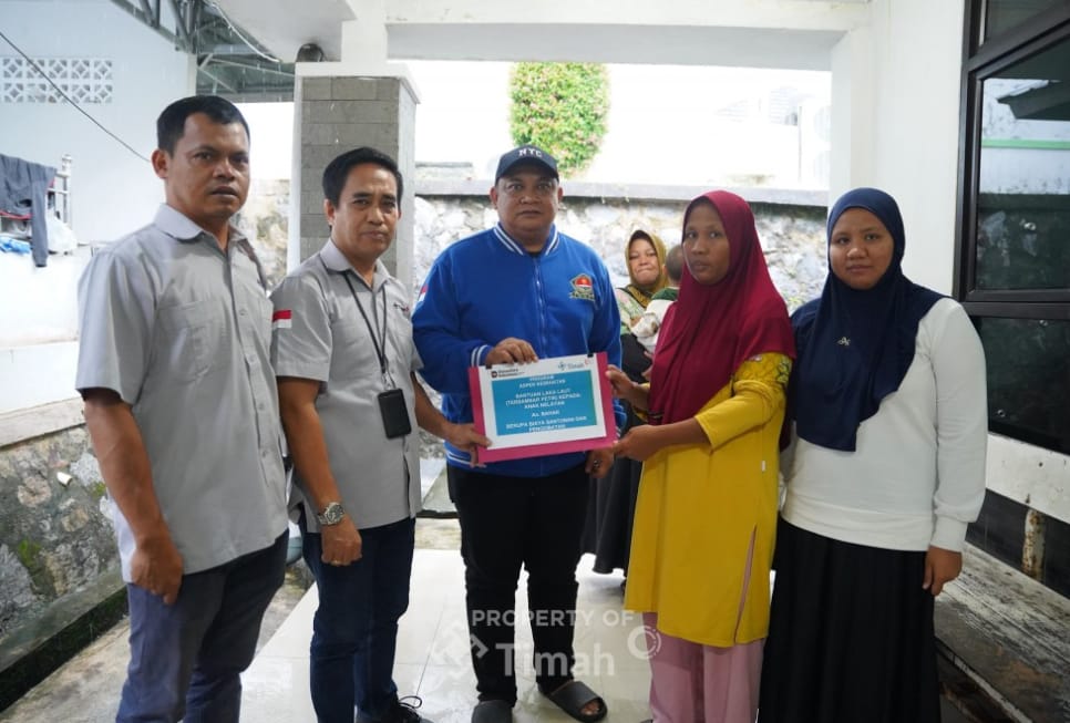 Bantuan dari PT TIMAH Tbk ini diserahkan langsung oleh Departement Head TJSL PT TIMAH Tbk, Risal Barung Mangontan kepada Winda (37) Ibu Baharudin yang turut disaksikan Ketua DPC HNSI Kabupaten Bangka, Slamet Riyadi, Rabu (10/12/2025),