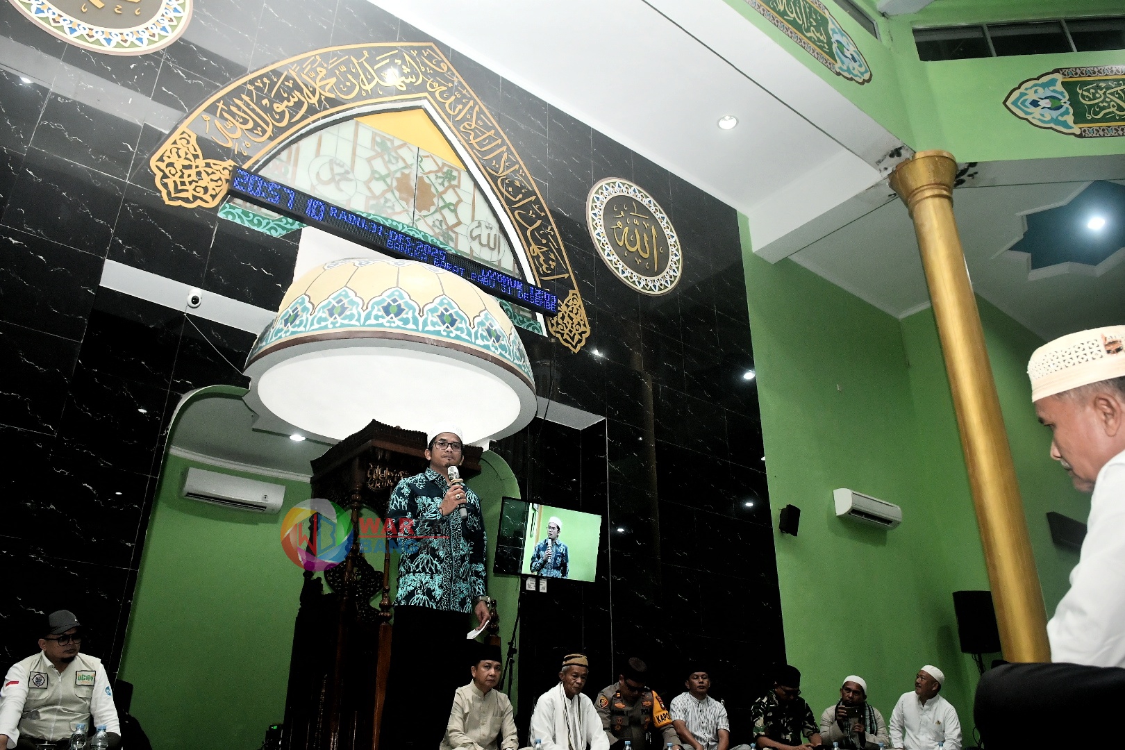 Ustaz Anugerah Cahyadi (Ucay) menyampaikan tausiah saat Safari Dakwah dan penggalangan dana kemanusiaan di Masjid Shirotholmustaqim, Kecamatan Kelapa, Kabupaten Bangka Barat, Provinsi Kepulauan Bangka Belitung (Babel), Rabu (31/12) malam. Kegiatan tersebut bertujuan mengajak masyarakat peduli terhadap korban musibah di Aceh, Sumatera Utara, dan Sumatera Barat, sekaligus mendukung pembangunan Pondok Pesantren Al-Qur’an Tunanetra. WARTABANGKA/Roni Bayu