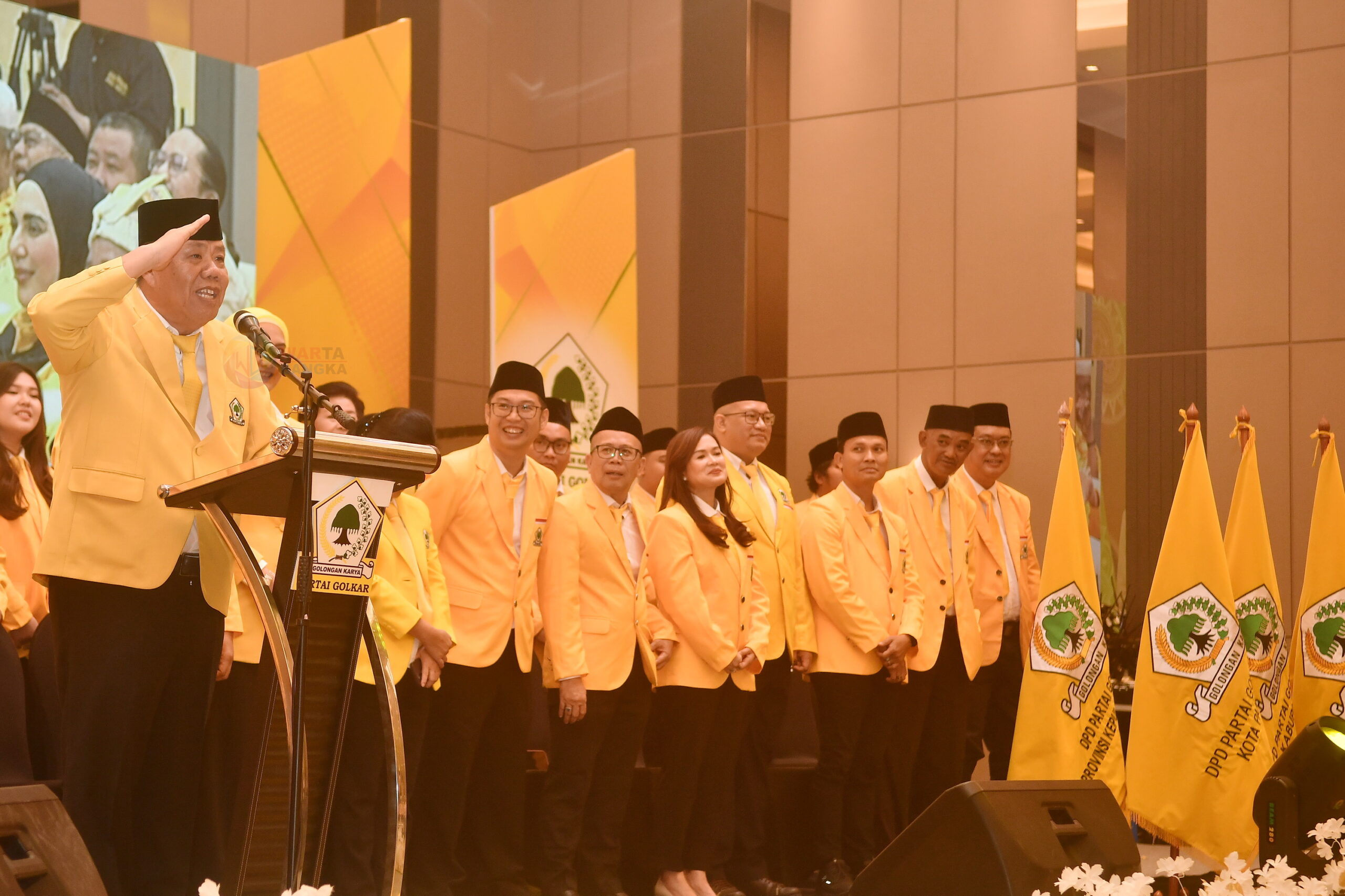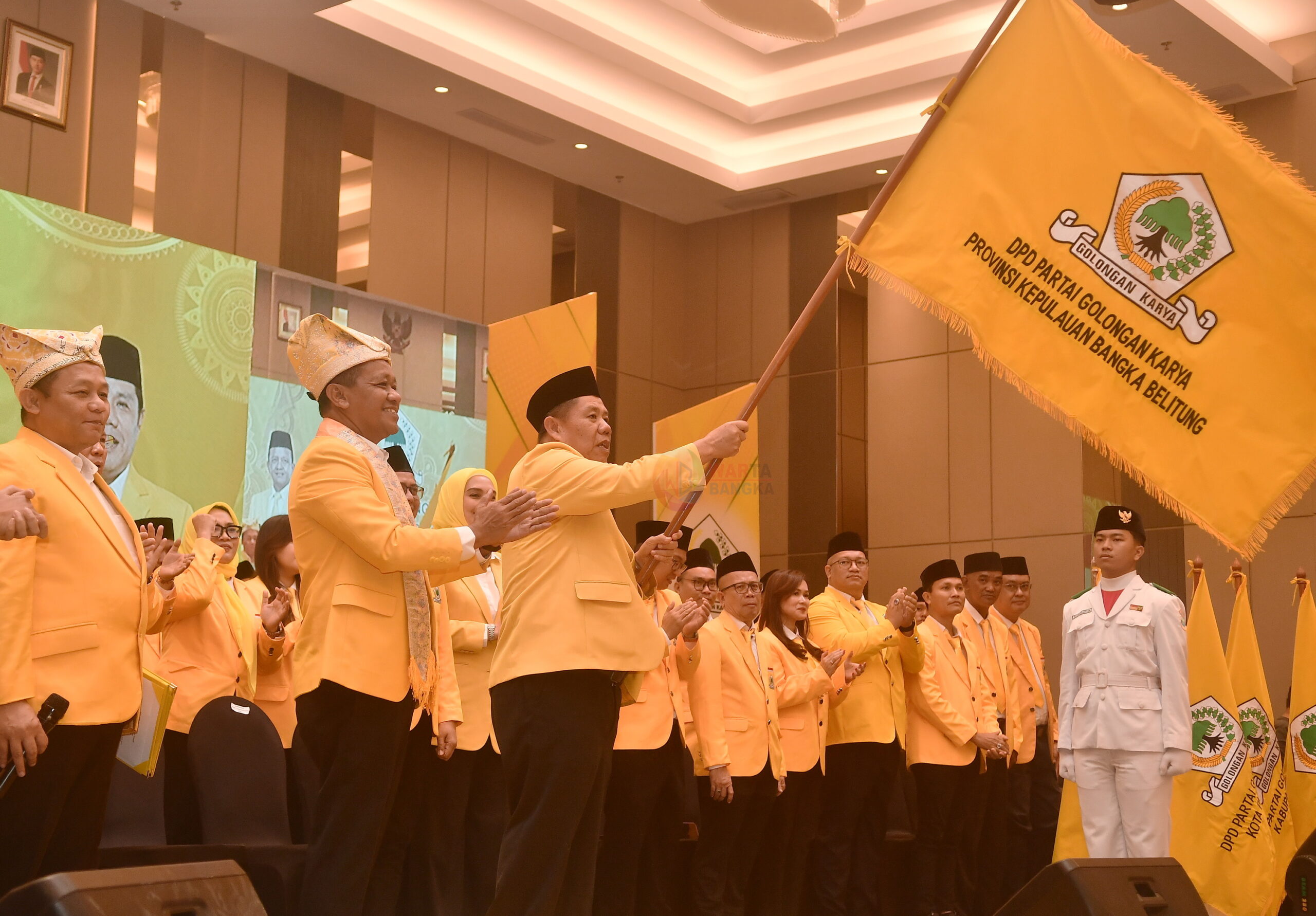 Ketua DPD Partai Golkar Provinsi Kepulauan Bangka Belitung Hidayat Arsani mengibarkan bendera Partai Golkar usai dilantik oleh Ketua Umum DPP Partai Golkar Bahlil Lahadalia, di Aston Emidary Hotel, Minggu (25/1). Pelantikan tersebut menjadi momentum konsolidasi Golkar Babel untuk memperkuat soliditas kader dan mengawal program prioritas nasional di daerah. WARTABANGKA/Roni Bayu