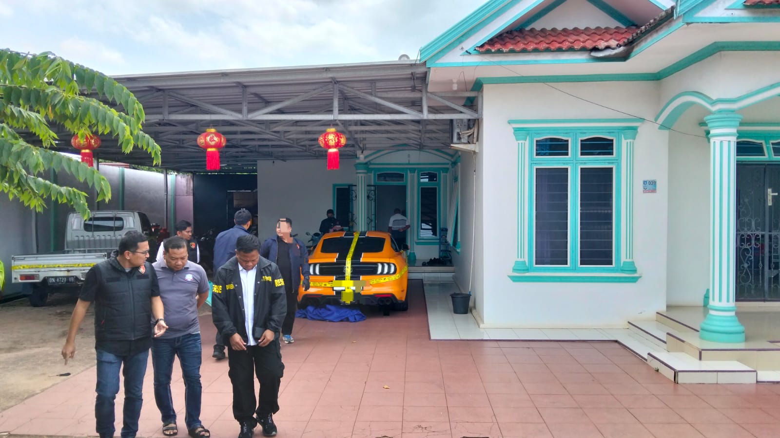 Tampak kendaraan mewah pribadi diduga milik bos tersebut turut dilakukan pemasangan garis polisi oleh anggota.